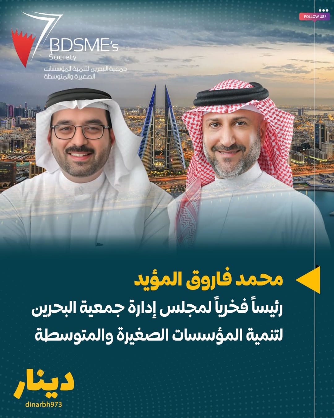 وافقت الجمعية العمومية لجمعية البحرين لتنمية المؤسسات الصغيرة والمتوسطة بالإجماع في اجتماعها يوم امس الأربعاء برئاسة سعادة النائب أحمد صباح السلوم رئيس مجلس الإدارة، على تعيين السيد محمد فاروق المؤيد رئيسا فخريا للجمعية، خلفا لوالده المغفور له بإذن الله السيد فاروق المؤيد الذي وافقت الجمعية العمومية على تغيير مسماه إلى الرئيس المؤسس للجمعية.