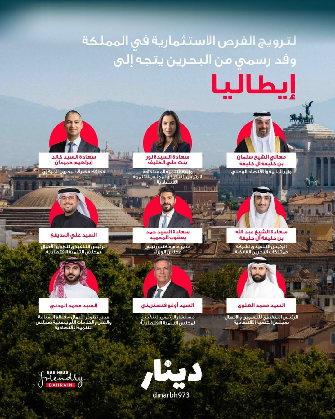 يتوجه وفدٌ رسمي من مملكة البحرين برئاسة معالي الشيخ سلمان بن خليفة آل خليفة وزير المالية والاقتصاد الوطني إلى الجمهورية الإيطالية في زيارة تستمر لمدة ثلاثة أيام وتشمل المدن الإيطالية روما وبارما وميلان، تستهدف عقد سلسلة من فعاليات الأعمال واللقاءات الرسمية مع القطاعين العام والخاص، بهدف تعزيز العلاقات الاقتصادية والتجارية بين مملكة البحرين والجمهورية الإيطالية، بالإضافة إلى التعريف بالفرص الاستثمارية المتنوعة في القطاعات ذات الأولوية في البحرين، بما في ذلك الخدمات المالية، وتكنولوجيا المعلومات والاتصالات، والصناعة، والخدمات اللوجستية، والسياحة.