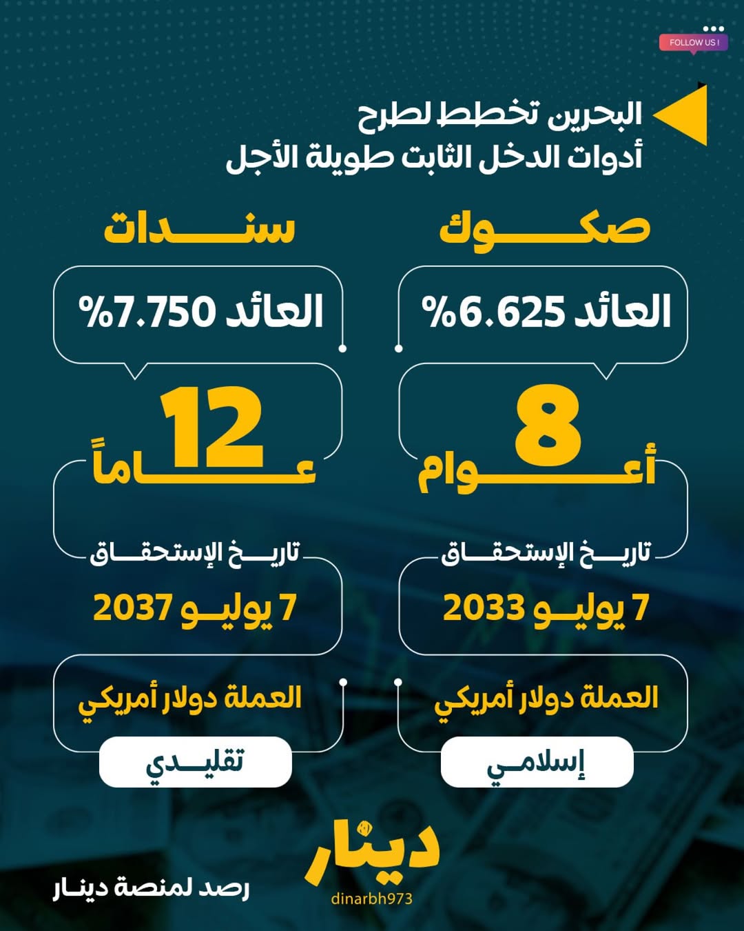 رصدت “منصة دينار” إصدارًا مزدوجًا لمملكة البحرين من الصكوك والسندات بالدولار الأمريكي، حيث يمتد أجل الصكوك لثماني سنوات تستحق في 7 يوليو 2033 بعائد يبلغ 6.625%، في حين تستحق السندات بعد 12 عامًا في 7 يوليو 2037 بعائد قدره 7.750%.