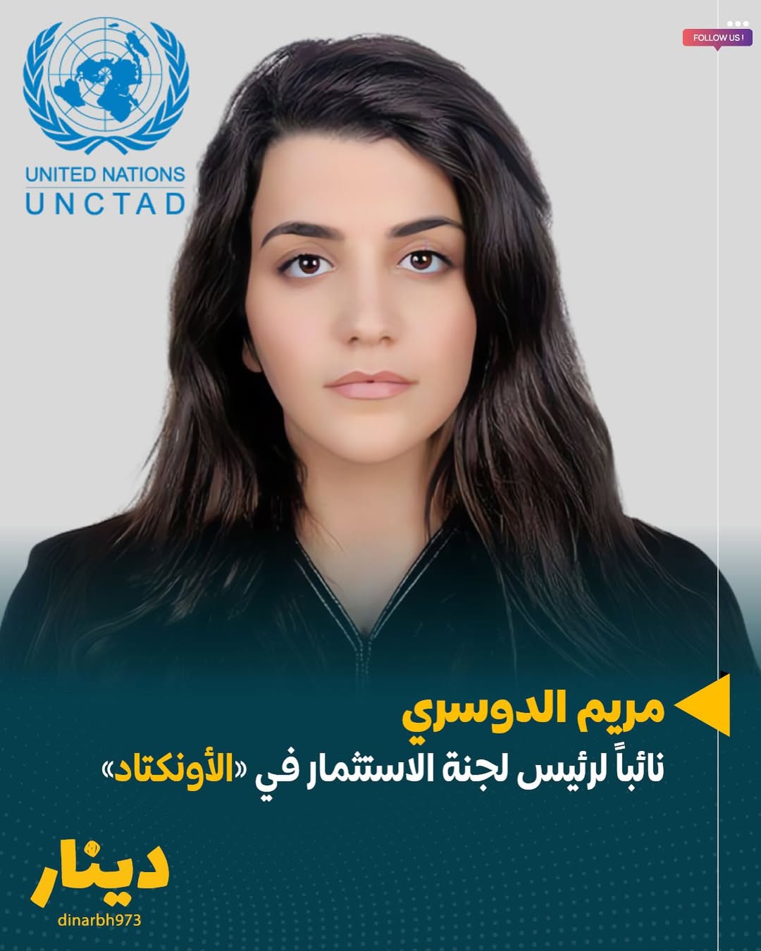 أعلنت منظمة مؤتمر الأمم المتحدة للتجارة والتنمية (UNCTAD) عن تعيين البحرينية مريم عبد العزيز الدوسري، الملحق التجاري في وزارة الصناعة والتجارة بمملكة البحرين، نائباً لرئيس الدورة الخامسة عشرة للجنة الاستثمار والتنمية التابعة للمنظمة، وذلك خلال أعمال اللجنة المنعقدة في جنيف.