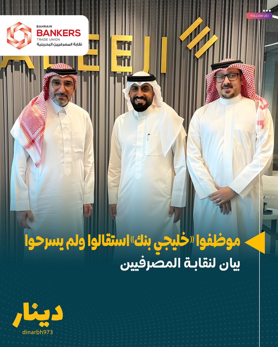 عقدت نقابة المصرفيين البحرينية برئاسة السيد هيثم الرشدان رئيس النقابة، اجتماعاً تشاورياً مع السيد سطّام سليمان القصيبي الرئيس التنفيذي لـ(خليجي بنك) إثر ما تم نشره وتداوله بخصوص قيام البنك بتسريح عدد من موظفيه البحرينيين، وقد تبيّن للنقابة عدم صحة ما تم نشره، حيث تم تداول الخبر تزامناً مع استقالة اثنين من موظفي البنك خلال نفس الفترة الزمنية، فيما أوضح البنك اتباعه لسياسات واضحة، سواء في ملف التوظيف أو ملف حقوق الكوادر البشرية لديه، مؤكداً أن البنك حريص على تطبيق شروط وأحكام قانون العمل في القطاع الأهلي بما يكفل حقوق ومصالح الموظفين، وبما يسهم في خلق بيئة عمل إيجابية وآمنة للموظفين.