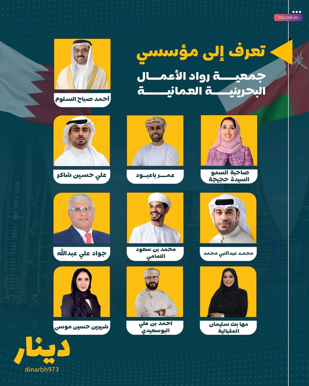 بادرت عشر شخصيات بحرينية وعمانية إلى تأسيس جمعية رواد الأعمال البحرينية العمانية، وهم صاحبة السمو السيدة حجيجه بنت جيفر بن سيف آل سعيد، أحمد صباح سلمان السلوم، علي حسين عبد الكريم شاكر، محمد عبد النبي إبراهيم محمد، شيرين حسين جاني علي موسى، جواد عبد الله، علي أحمد عبد الله، أحمد بن علي بن سالم البوسعيدي، محمد بن سعود بن محمد التمامي، عمرو بن عبد الله بن صالح با عبود، مها بنت سليمان بن علي المقبالية.