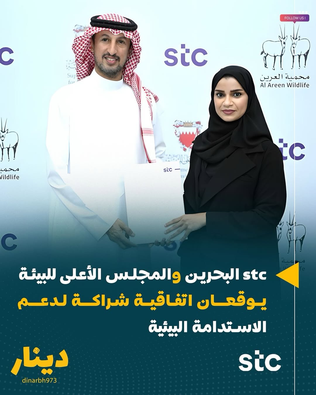 وقّعت شركة stc البحرين، المُمَكِّنُ الرقمي، اتفاقية شراكة استراتيجية مع متنزه ومحمية العرين التابع للمجلس الأعلى للبيئة، تمتد لثلاث سنوات، وذلك في إطار دعم الجهود الوطنية الهادفة إلى حماية الحياة الفطرية وتعزيز مبادئ الاستدامة البيئية في مملكة البحرين.