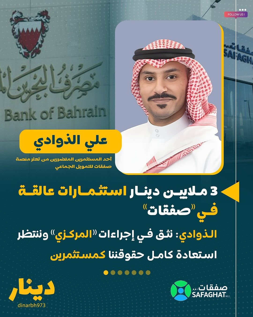 أكد علي الذوادي، أحد المستثمرين المتضررين من منصة “صفقات”، أن حجم الاستثمارات العالقة يقدّر بنحو 3 ملايين دينار بحريني تم ضخها في أكثر من 220 صفقة، مشيرًا إلى ثقته في إجراءات مصرف البحرين المركزي وقدرته على استرداد الحقوق كاملة، في ظل متابعة قضائية ورقابية مستمرة .