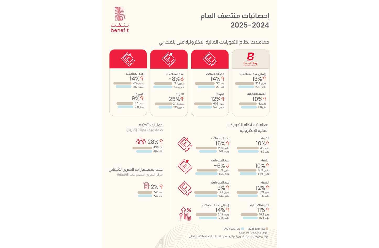 وأصدر مركز البحرين للمعلومات الائتمانية الذي تديره شركة «بنفت» حوالي 246 ألف تقرير ائتماني خلال النصف الأول من العام 2025 بزيادة قدرها 2% عن نفس الفترة من العام الماضي حيث تم إصدار 242 ألف تقرير.