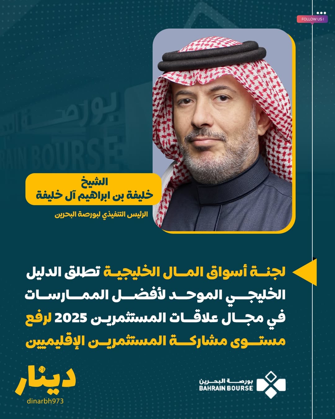“يعد إطلاق الدليل الخليجي الموحد لعلاقات المستثمرين لعام 2025 إنجازًا نوعياً ضمن جهودنا المشتركة لتعزيز وتطوير أفضل ممارسات علاقات المستثمرين في أسواق دول مجلس التعاون الخليجي. وتعكس هذه المبادرة التزامنا بتطوير مفهوم علاقات المستثمرين لدى الشركات المدرجة في المنطقة، من خلال تزويدها بالأدوات والإرشادات اللازمة لتأسيس مهام فعالة في هذا المجال، بما يسهم في تعزيز جاذبية أسواق دول المجلس للمستثمرين الدوليين. وتفخر بورصة البحرين بدورها الفاعل في هذا التعاون الإقليمي، الذي يسهم في ترسيخ متانة أسواق رأس المال، ويعزز من ثقة المستثمرين ومبدأ الشفافية في الأسواق.”