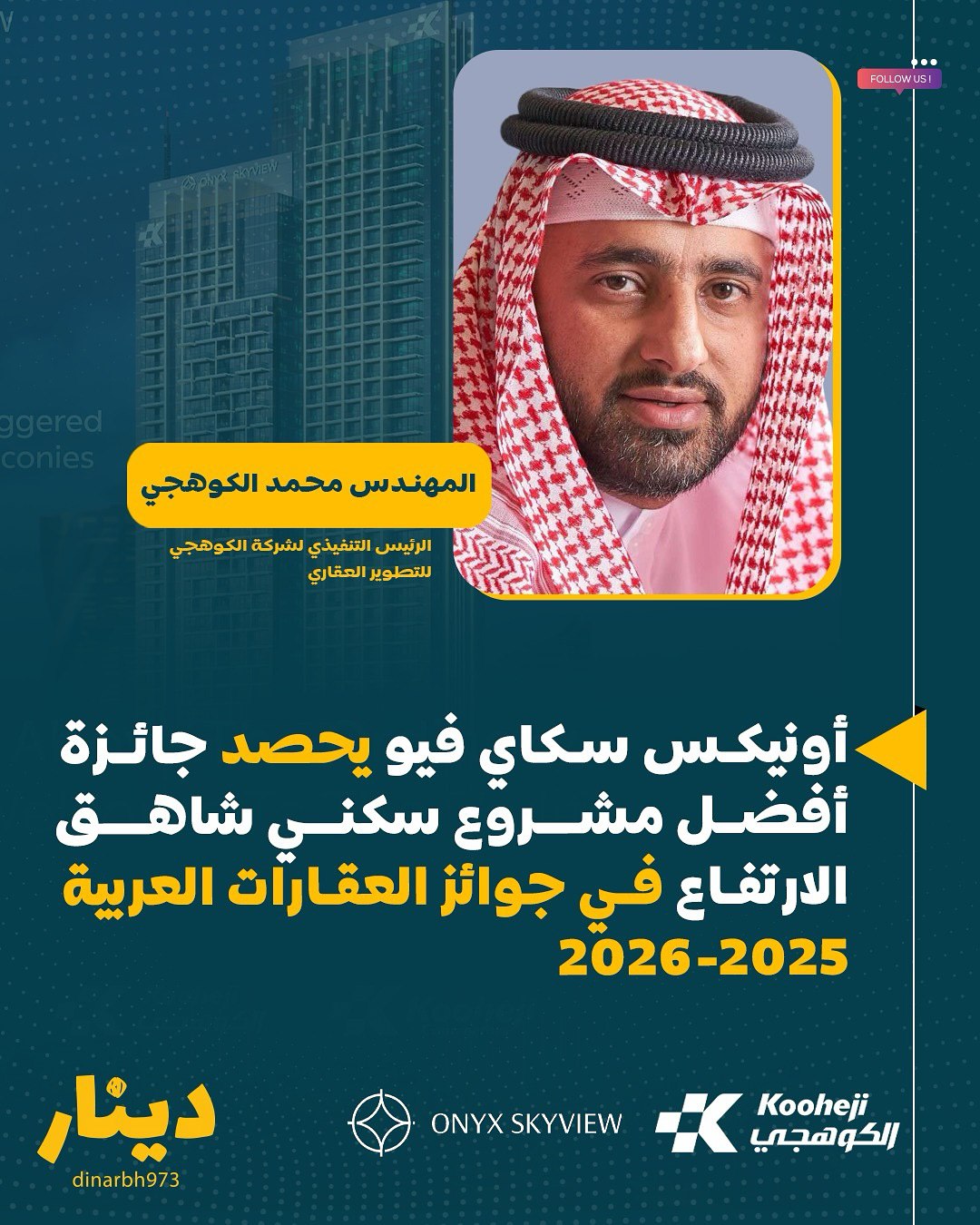 وبهذه المناسبة، أعرب المهندس محمد الكوهجي، الرئيس التنفيذي لشركة الكوهجي للتطوير العقاري، عن فخره بهذا الإنجاز، قائلاً: “نفخر بفوز مشروع أونيكس سكاي فيو بهذه الجائزة المرموقة التي تكرّس مكانته كأحد أبرز المشاريع السكنية في مملكة البحرين، وتؤكد ثقتنا الكبيرة في علامتنا التجارية وقدرتنا على تقديم مشاريع تواكب أعلى معايير الجودة والفخامة. إن موقع المشروع المميز في قلب العاصمة، قرب أبرز المعالم الفاخرة، يعزز قيمته الاستثمارية ويجعله وجهة مثالية لنمط حياة راقٍ بمعايير عالمية.”