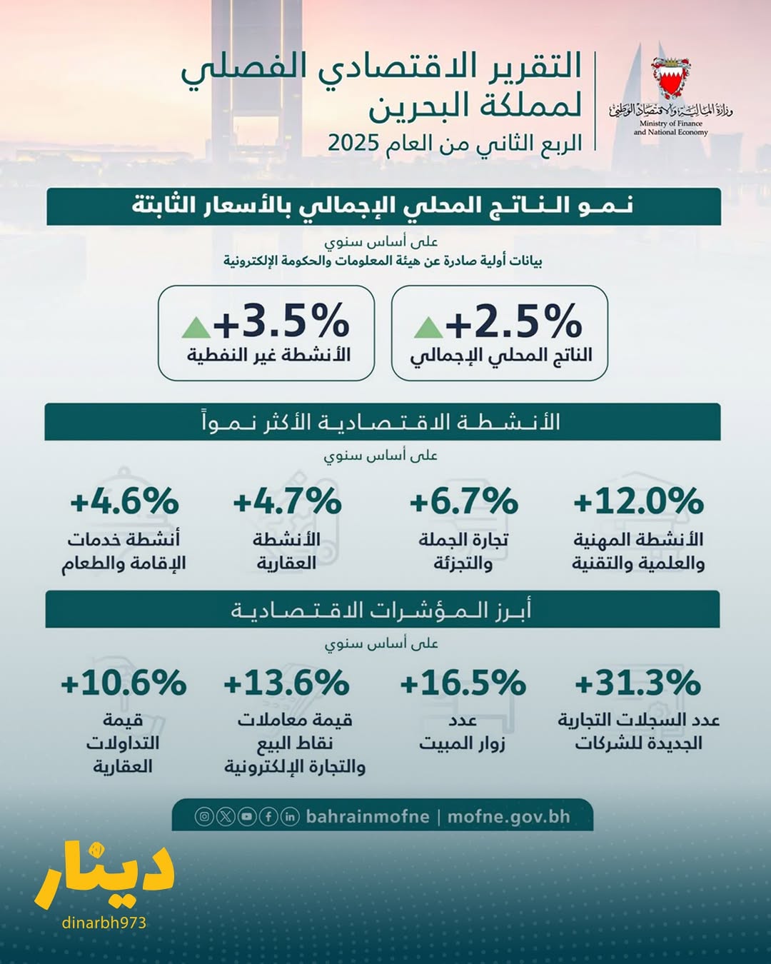 نشرت وزارة المالية والاقتصاد الوطني اليوم التقرير الاقتصادي الفصلي لمملكة البحرين للربع الثاني من عام 2025 عبر موقعها الإلكتروني