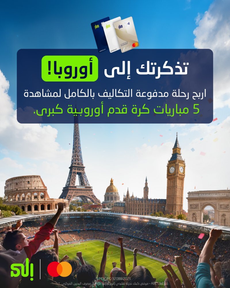 أطلق بنك “إلى” التابع لبنك ABC، أول حملة من نوعها لعشاق كرة القدم. تُتيح الحملة الفرصة لعميل محظوظ من حاملي بطاقات “إلى” الائتمانية لحضور خمس من أبرز مباريات كرة القدم الأوروبية مع التكفل بكافة المصاريف. تستمر الحملة حتى تاريخ 31 ديسمبر 2025 وسيتم اختيار الفائز عن طريق السحب.