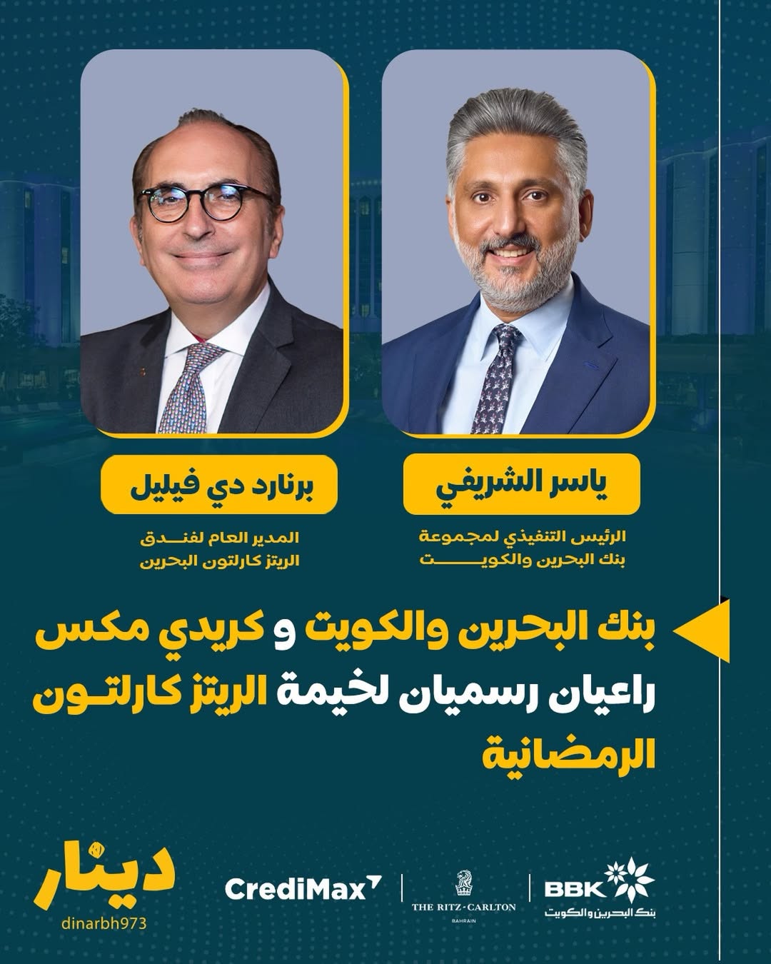 أعلن بنك البحرين والكويت، الرائد في مجال الخدمات المصرفية للأفراد والمؤسسات في مملكة البحرين، بالتعاون مع كريدي مكس، الشركة التابعة والمملوكة بالكامل للبنك، عن رعايتهما الرسمية للخيمة الرمضانية بفندق الريتز كارلتون البحرين، وذلك في إطار حرصهما على تقديم مزايا حصرية لعملائهما وتعزيز تجربتهم المالية خلال شهر رمضان المبارك.