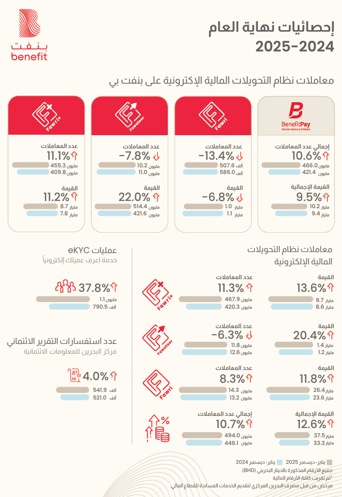 وأوضحت الشركة أن حجم إجمالي معاملات “فوري +” على جميع القنوات، بلغ 467.9 مليون معاملة بزيادة 11.3% عن العام الماضي الذي بلغت خلاله 420.3 مليون معاملة، بقيمة إجمالية من 8.6 مليار دينار بحريني إلى 9.7 مليار دينار بحريني في العام 2025، مسجلةً بذلك زيادة 13.6%. أما عبر “بنفت بي”، فقد شهدت المعاملات زيادة بنسبة 11.1% حيث وصلت إلى 455.3 مليون معاملة بقيمة 8.7 مليار دينار بحريني.