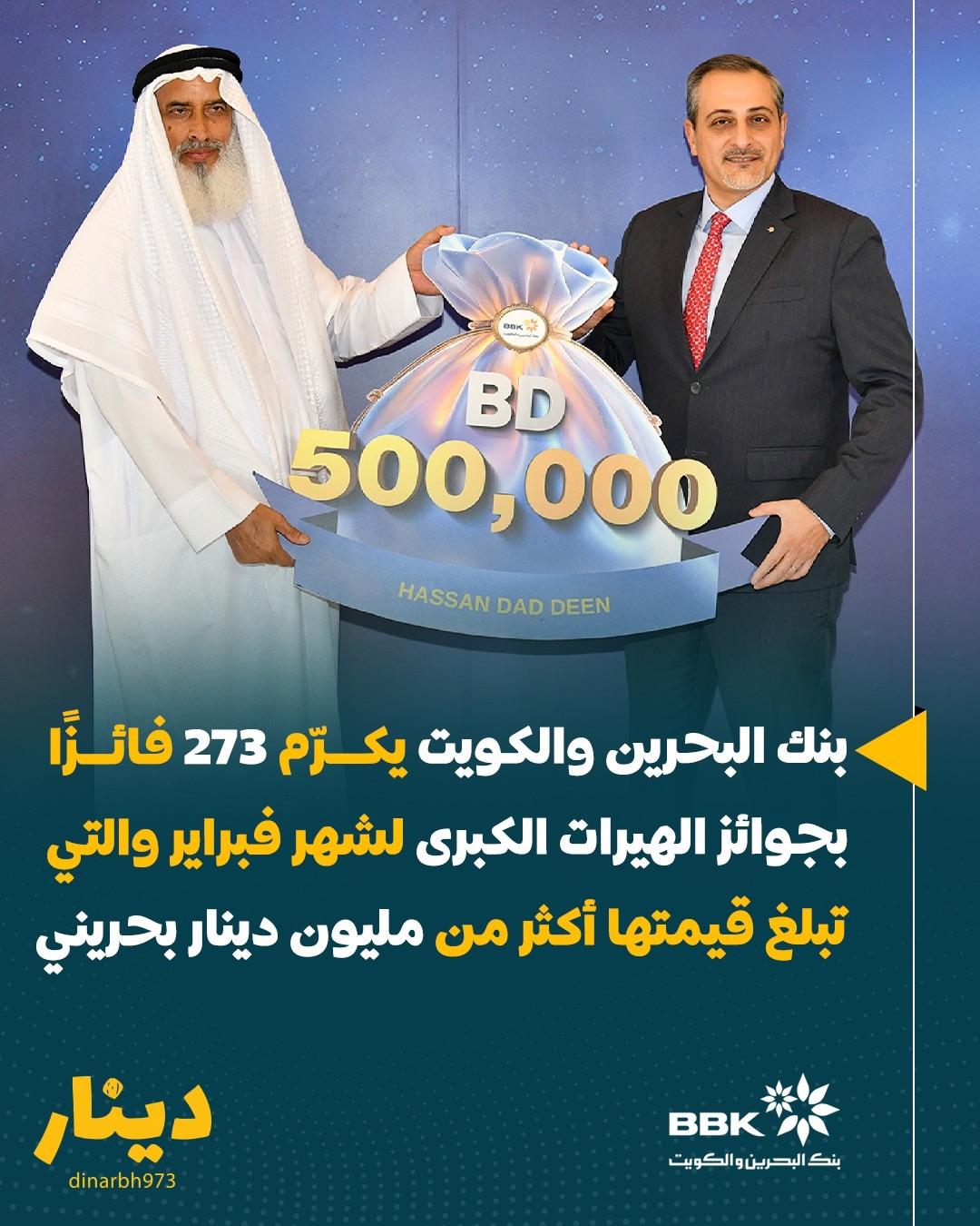 أعلن بنك البحرين والكويت، الرائد في مجال الخدمات المصرفية للأفراد والمؤسسات في مملكة البحرين، عن أسماء الفائزين المحظوظين في سحوبات شهر فبراير على الجوائز الكبرى الهيرات، حيث تم تتويج 273 فائزاً بجوائز ضخمة تبلغ قيمتها أكثر من مليون دينار بحريني.